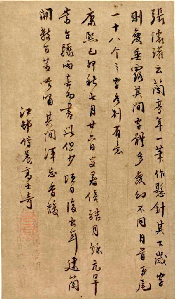 高士奇是清代在文史哲诸方面都有贡献的学者,学识渊博,能诗文,擅书法,精考证,善鉴赏,所藏书画甚富。录《张怀瓘〈论兰亭语〉》,阐述笔法贵在变化。长款比正文更有意思:“康熙已卯秋七月廿六日,处暑倍酷,月余亢旱,当午骤雨,喜而书此,但少倾日复书耳。建兰开数百茎,吟啸其间,浑忘香馥。”此篇书于1699年,髙士奇时年55岁,书风纯熟悠游,婉转流媚,为晚年精美小品。清初收藏大家有“三家村”之说——就是字号中都有一个“村”字,梁清标字棠村,安岐号麓村,高士奇号江村。梁棠村和安麓村以藏品宏富精绝著称,高江村尤以鉴赏水平高超而闻名。