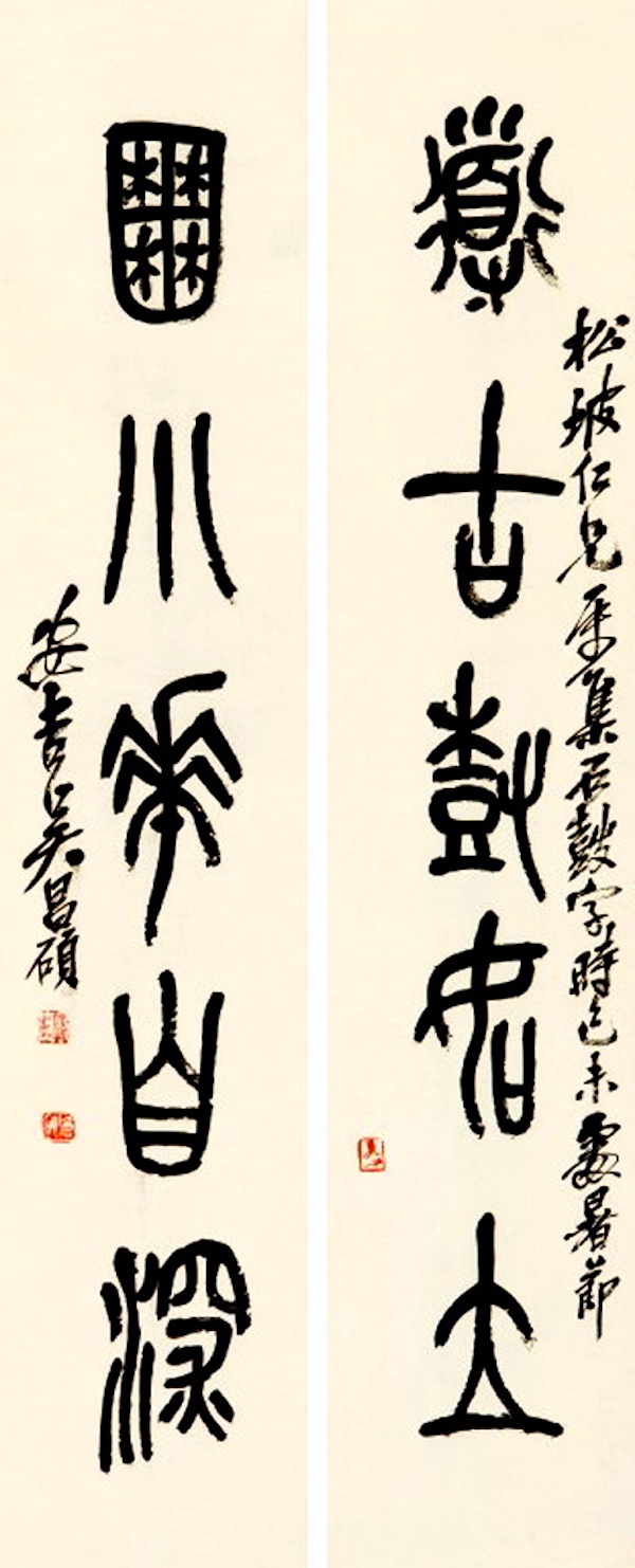 近代 吴昌硕导古囿小篆书联 己未处暑