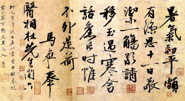 明代马愈和宋代王岩叟类似,在书家群体中几乎不被关注。但他的《暑气帖》,不乏精彩之笔。“暑气初平,颇有凉思。十一日敬洁一觞,敢请移玉过寒舍话旧片时,惟不外是荷。马愈奉医相杜先生阁下。”《暑气帖》是马愈邀请朋友医相先生来访叙旧的书信。“暑气初平,颇有凉思”八字,将处暑特点写的淋漓尽致。因系友人间来往信札,书写随意,行笔纵横不羁,体势开张,气息宕逸,深受黄庭坚影响。陈其锟在跋中称:“此书骨力排奡,纵宕不羁”。