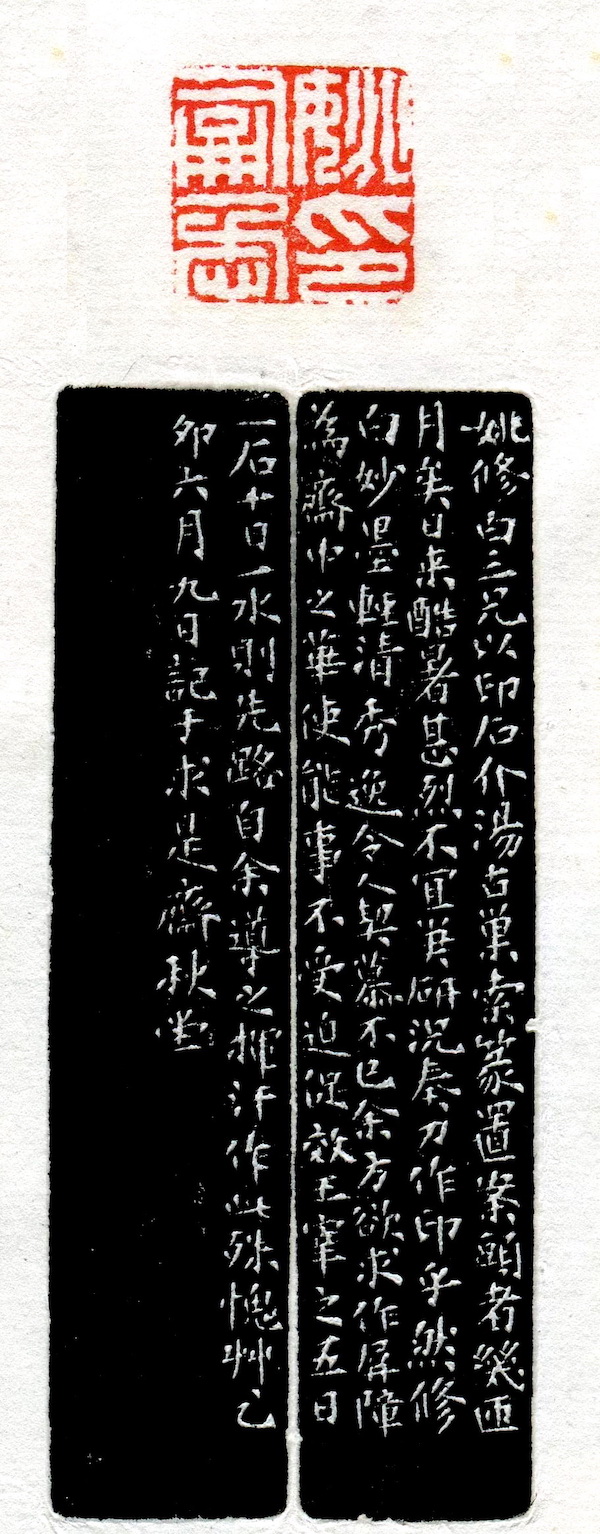 陈豫钟是“西泠八家”之一,所刻“姚嗣懋印”从汉印化出。印风工整含蓄,法度严谨,刀法在浙派诸子中最为内敛。浙派印人的边款,有时比印文更用心,也更有意思,“姚修白三兄以印石介汤古巢索篆,置案头几匝月矣。日来酷暑甚烈,不宜笔研(砚),况奏刀作印乎!然修白妙墨轻清秀逸,令人契慕不已。余方欲求作屏障,为斋中之华使。能事不受迫促,效王宰之‘五日一石,十日一水’,则先路自余导之。挥汗作此,殊愧草草。”虽然说“日来酷暑甚烈,不宜笔砚”,但印章还是刻了,“挥汗作此,殊愧草草”,方寸之间,还是要考虑“能事不受迫促”。陈豫钟的边款在当时即享有盛名。求其印者皆喜其款字,常有索作长跋者,皆欲其款字“多多益善”。陈豫钟是明清以来第一个专注边款技法研究的印人。