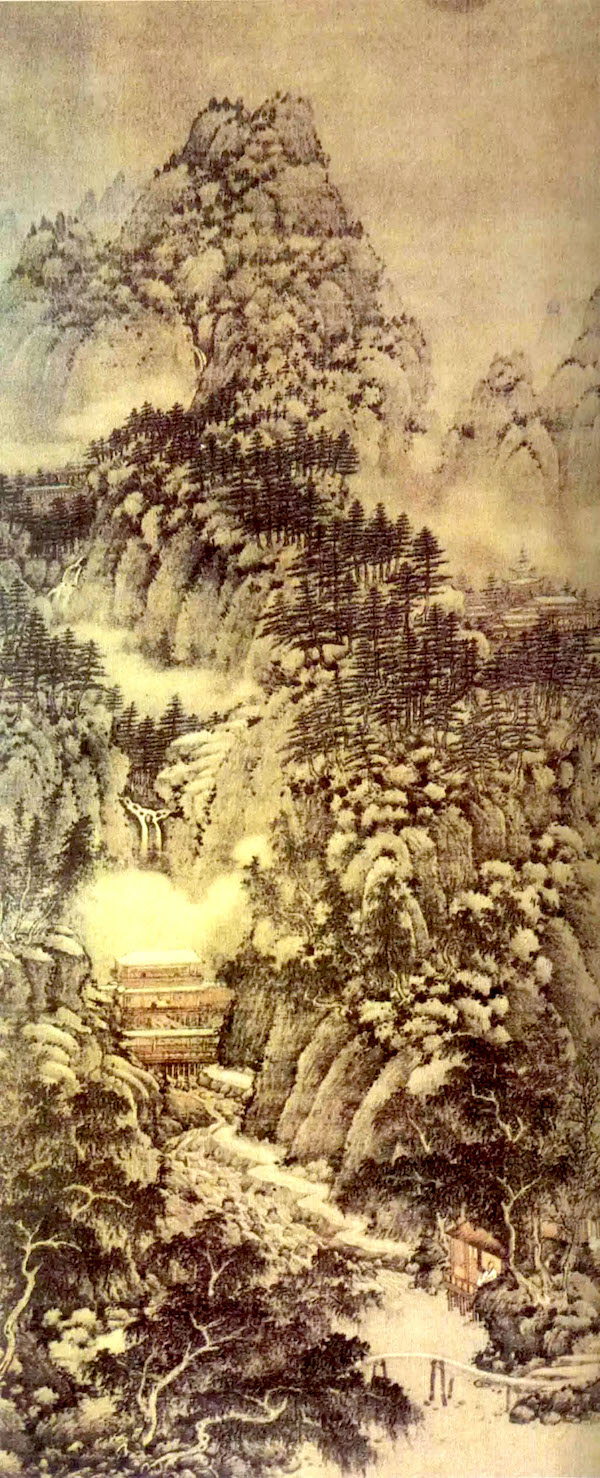 说到巨然,不仅想到三国嵇康写给朋友山涛(字巨源)的一封信,名之曰《与山巨源绝交书》,赵孟頫和王铎都曾入书。巨然和巨源极易混淆。巨然是历史中有记载的第一个僧人大画家。《秋山问道图》为其传世名作之一,主峰居中,显示出五代宋初的典型构图法。前人谓巨然山水,善写烟岚气象,“于峰峦岭窦之外,至林麓之间,犹作卵石、松柏、疏筠、蔓草之类,相与映发,而幽溪细路、屈曲萦带、竹篱茅舍、断桥危栈,真若山间景趣也”。画中之山,乃典型的江南丘陵,土复石隐,圆浑厚实。山顶多“矾头”,坡石用长、短披麻皴描绘,不求奇峭而显得平和凝重。山体用淡墨烘染,于山石之凹处以浓墨、焦墨点苔,以显现江南山水之湿润郁秀、生机流荡。笔性温和,不装巧趣。这就是巨然创造出来的用以描绘“淡墨轻岚”的江南山水的一整套“皴、擦、点、染”的技法。身在山林,穿梭于其间,“行走”、“云游”加上“问道”,“只在此山中”,不过问世事,何等逍遥!
