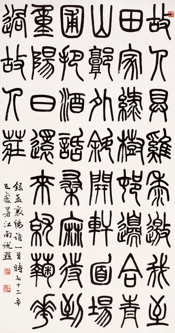 萧退庵是吴昌硕的“死对头”。曾批评吴昌硕的书法,“篆法扫地,村气满纸”,对于缶庐之印,更是毫不留情,“天下篆刻之坏,始于吴昌硕”。按理说,萧应该算是晚辈,不应该口出狂言。事实上,存在“口是心非”的一面,萧的篆书取法吴昌硕,从他的孟浩然《过故人庄》作品可一眼辨识。处暑时节,写“待到重阳日,还来就菊花”这样的句子,比较应景。全幅基本是用圆笔,笔法较直接,流丽畅达,结构少变化,俊挺敦厚,个人风格显著。萧退庵平生主张书贵自然,以造作为书家大忌。这一理念明显地体现在他的篆书创作中,认为吴昌硕将字形左右错位有伤蕴藉,也算是批判地吸收吧。萧退庵以篆书名扬大江南北,做到“上窥周、秦、汉代金石遗文,能融大小二篆为一”,说到根子,面对吴昌硕,内心不服气,似有“崔颢题诗在上头”的遗憾。