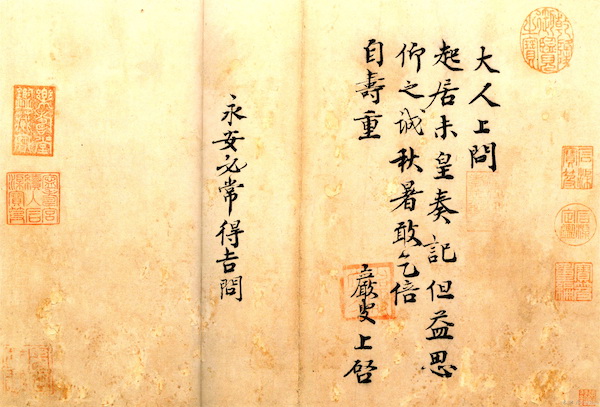 在高手如云的宋代书家群体中,王岩叟相比之下,几乎可以说是“寂寂无名”。殊不知,他乃状元出身,朝廷重臣,一生才华横溢、刚直不阿,政绩卓著,建树颇丰。《秋暑帖》可谓是好书数行:“大人上问起居,未皇奏记,但益思仰之诚,秋暑敢乞倍自寿重。岩叟上启,永安,必常得吉问。”从内容来看,是叮嘱朋友在处暑时要注意养身保重。起笔露锋芒,且多渴笔,注重横细直粗的对比,字形多半是正方,全作精谨,点画之间,一丝不苟,充分反映他重视法度的性格,严谨的处事习惯在字里行间一览无余。