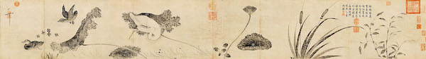 宋太祖黄袍加身,马上得天下,乃武将本色。其后的历代皇帝,多为文人,不爱江山爱丹青,以宋徽宗赵佶为最。所作《池塘秋晚图》的构图,以荷鹭为主体,将各种动、植物分段逐次安排在画面上,此种布局为唐代以前所习见的构图形式。以各种手法营造出动静对比、色彩对比,令观者常有意犹未尽之感。此作一直有真伪争议。整体上来看,符合徽宗的笔情墨意,只是御押及印玺皆拙劣,可能是卷尾遭裁切后,后人加上了伪印、伪押。