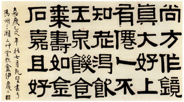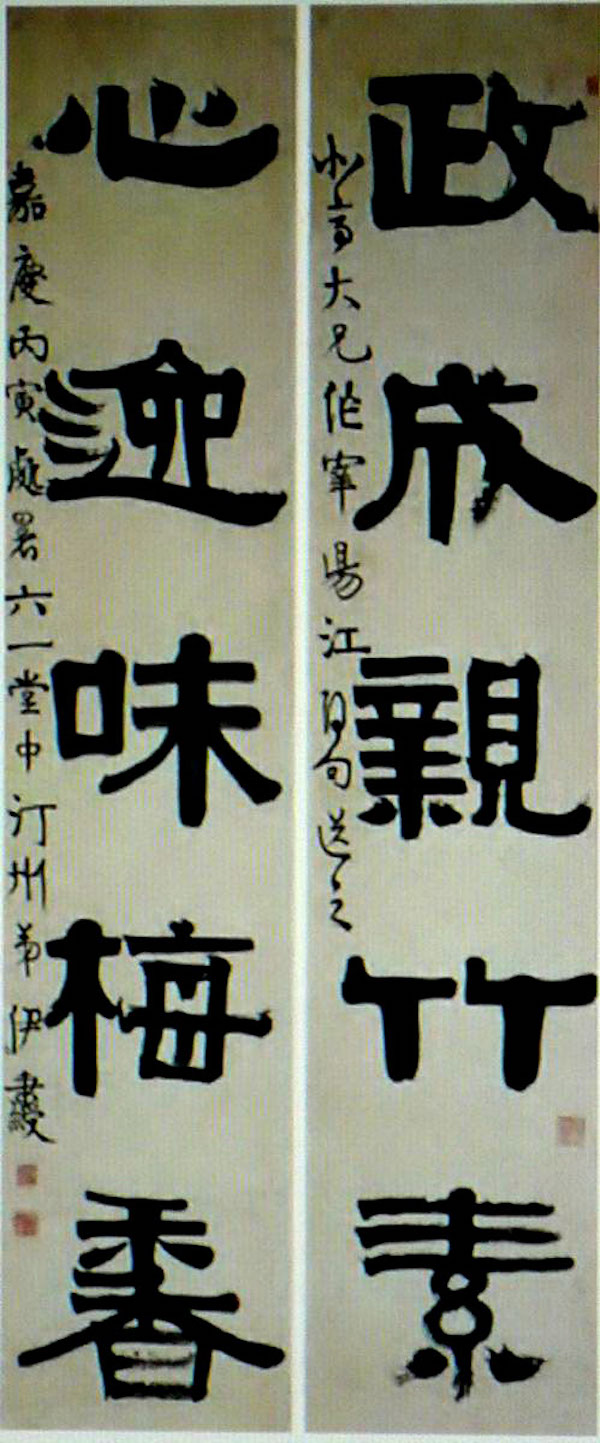 清代伊秉绶是集联“狂人”,一生的对联占平生作品超过半壁江山,主要得力于他的同乡——“楹联大师”梁章钜。“政成亲竹素,心逸梅味香”联作于丙寅年,伊秉绶52岁,属于典型的成熟期风格。从汉镜铭文横幅,可以看出伊秉绶的取法,路子很广,不拘一格,“尚方作镜真大好,上有仙人不知老。渴饮玉泉饥食栆,寿如金石嘉且好。”古人的词句,总是通俗易懂,且朗朗上口。最具意味的是落款也有“七月既望”的字样,与苏轼遥隔733年。伊秉绶和苏轼之间确实有缘分。嘉庆四年(1799),伊秉绶出任广东惠州知府。在重修苏东坡故居时,意外地从墨池里发现苏氏珍爱的“德有邻堂”端砚,伊秉绶带回了汀州宁化老家,并把书斋命名“赐砚斋”。这块苏东坡用过的端砚,给伊秉绶带来了无尽的灵气。此砚如今珍藏于博物馆。伊秉绶的隶书,浑厚中见灵动,大巧若拙,原因在于个人的真性情,是一个真汉子。1807年因为丁忧回乡,呆了三年,又感觉到仕途疲惫,遂又在宁化隐居五年。前后足足有八年的时间,专心创作。