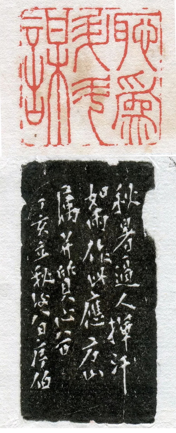 程庭鹭虽名不显,但印艺颇精,“耻为升斗谋”似有意选之,与赵之谦的“为五斗米折腰”相映成趣,边款有记:“秋暑逼人,挥汗如雨,作此应方山嘱,并质心谷。丁亥立秋后八日”。此五言句出自秦观《春日杂兴十首其一》,全句有云:“缪挟江海志,耻为升斗谋。”秦观科举落第,抱有“江海志”的希望化为泡影,故有此论。虽是议论,但这种透露点滴心迹的比喻手法,将现实的沉重与自己落第的心绪有机地结合起来,直抒胸臆,不免黯然神伤,却包含了真挚、豪迈的情感。程庭鹭篆刻以浙派丁敬为宗,复追秦汉印章。此方朱文印,五字以三列排布,章法上密下疏,上下皆有笔画连接印框,整齐平稳。冲切中有痛快淋漓之感,颇得刀笔意趣,鲜活灵动。笔画痩硬健挺,字形典雅灵活,增添了含蓄凝重之美。