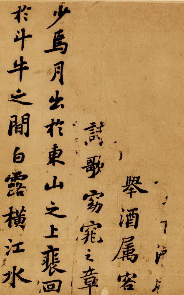 宋神宗元丰五年(1082)七月十六日,苏轼时年四十八岁,与友人乘舟游览黄州城外赤鼻矶,遥想八百多年前,三国时代孙权破曹军的赤壁之战,故作《赤壁赋》,表达对宇宙及人生的看法。苏子情驰神纵、超逸优游的心神于其中可见,成就千古名篇,书文合一。此卷用笔锋正而劲健,力透纸背,结字矮扁而紧密,力量凝聚收敛在筋骨中,可谓纯绵裹铁,全篇笔墨丰润沉厚,有一种静穆深远的气息,乃中年时期少见的用意之作。不过依据书写习惯来推测,当不是首稿,而是抄稿,也就是定稿作品,否则不会如此整洁。如果第一次的手稿可以留存,相比会更见趣味。开篇第一句是:“壬戌之秋,七月既望”,“望”即“望日”,指阴历的每月十五。七月十五乃是中元节。“既望”在后一天,也就是阴历十六,说明苏轼是在中元节后一天到达赤壁的。2021庚子年七月既望,正好是处暑节气的正日。日月如梭,苏轼这名篇流传已近千年。当年他所感慨的依然是我们所感喟的:“寄蜉蝣于天地,渺沧海之一粟。哀吾生之须臾,羡长江之无穷。挟飞仙以遨游,抱明月而长终。知不可乎骤得,托遗响于悲风。”文人心性,千古不易。