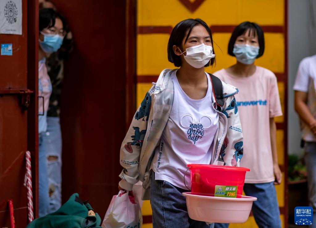 杨丽梅带着生活用具进入校园(8月23日摄)。