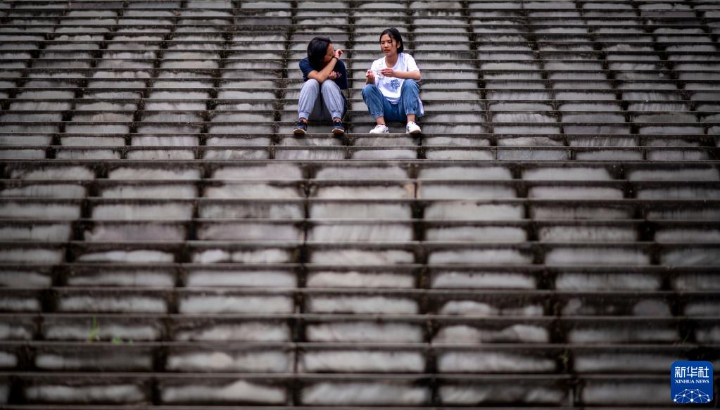 杨丽梅(右)与同学一起在校园里聊天(8月23日摄)。