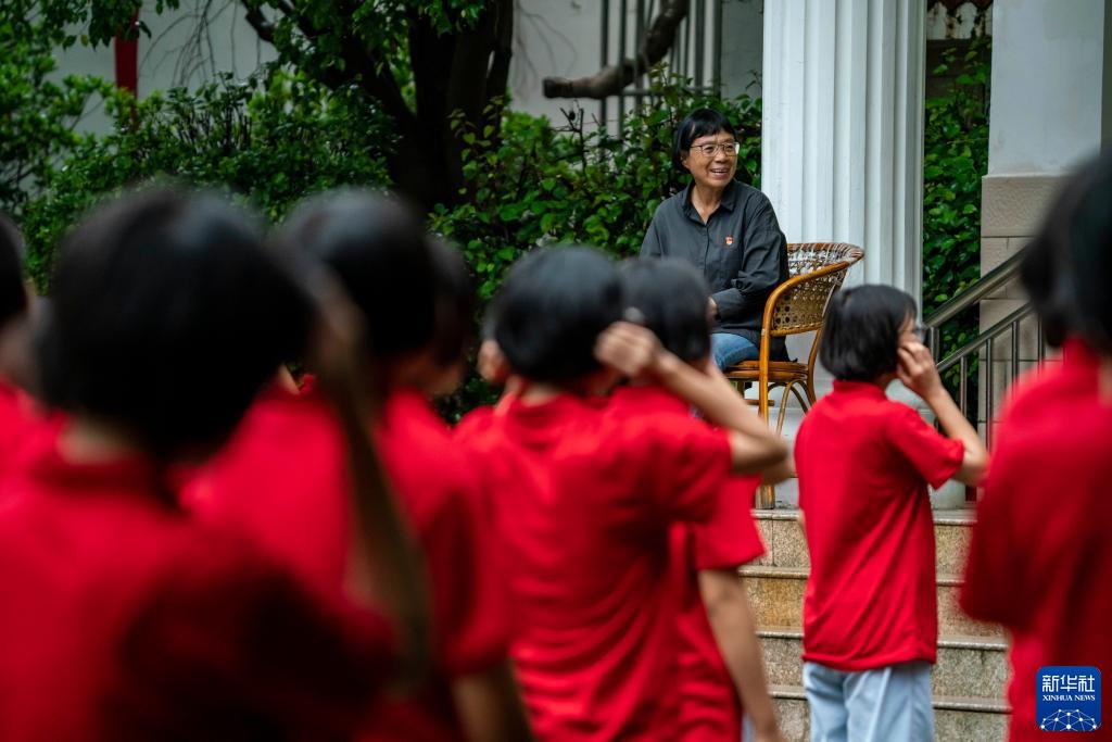 杨丽梅(右)与张桂梅在校园内交谈(8月23日摄)。
