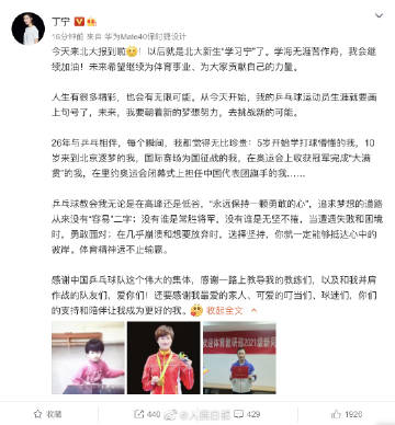 6日,中国乒乓球“大满贯”运动员@丁宁宣布结束运动生涯,已入学北大并完成报到。丁宁发文回忆自己与乒乓球相伴的26年,称乒乓球教会自己无论是在高峰还是低谷,“永远保持一颗勇敢的心”,并感谢中国乒乓球队及球迷。祝福北大新生“学习宁”!