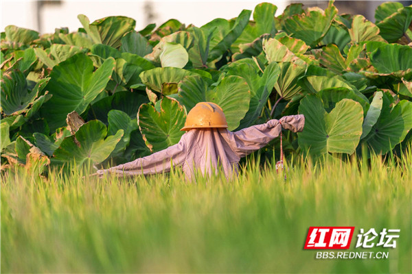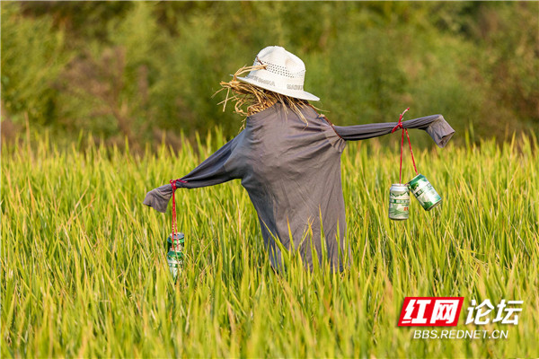 在蓝山县富阳村一块稻田里,发现三个现代版的稻草人。