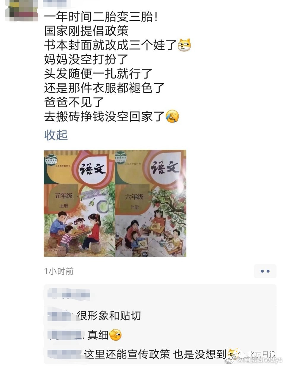 一年的时间,课本封面由二胎变成了三胎,妈妈也不打扮了,头发随便一扎,衣服还是去年那件,只是旧了。多了个娃,爸爸也不在家下棋了,估计为了养家加班挣钱去了。