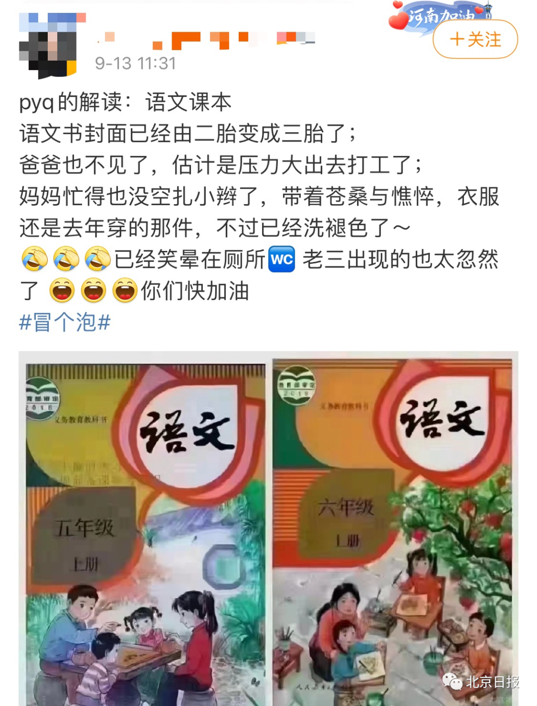 这段“看图说话”因为贴近“三胎”的社会热点,迅速引发了众多网友的共鸣、转发。