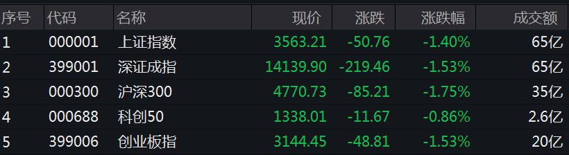 中秋假期后首个交易日,三大指数集体低开。上证指数跌1.40%,报3563.21点,深证成指跌1.53%,报14139.90点,创业板指跌1.53%,报3144.45点。