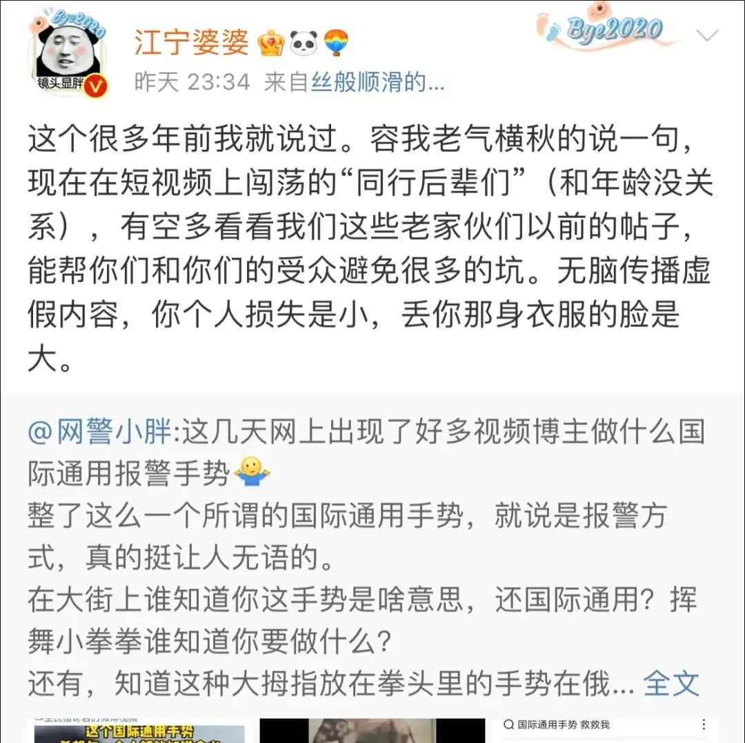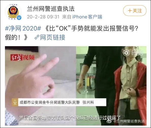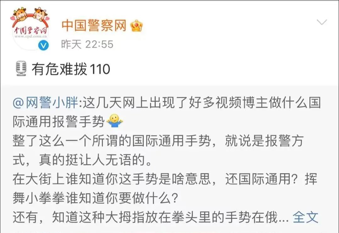 24日,沈阳网警巡查执法团队负责人微博@网警小胖 转发了相关帖子后无奈表示,“整了这么一个所谓的国际通用手势,就说是报警方式,真的挺让人无语的。普通网民不明就里跟风做这个,我们还可以理解,但是,警方账号也跟风做?是不是有些说不过去了!”