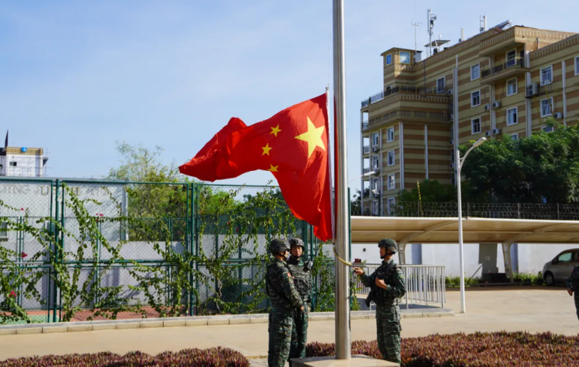 当地时间10月1日清晨,中国驻南苏丹使馆举行升旗仪式,庆祝中华人民共和国成立72周年。使馆全体工作人员、中国第九批援南苏丹医疗队参加。