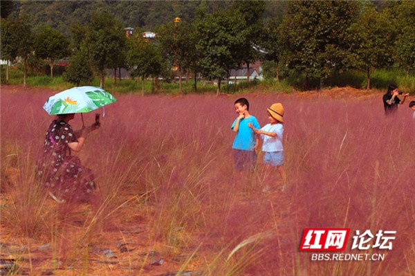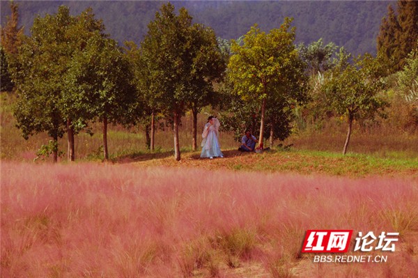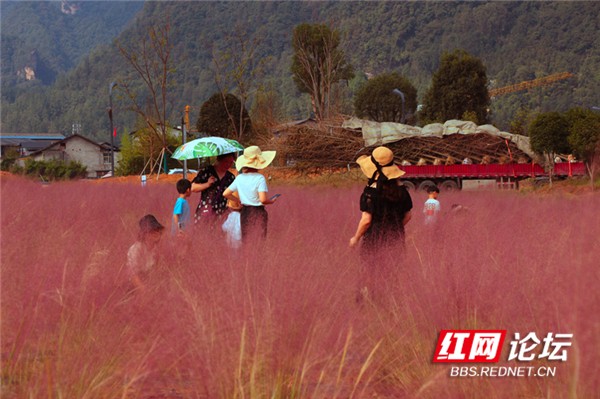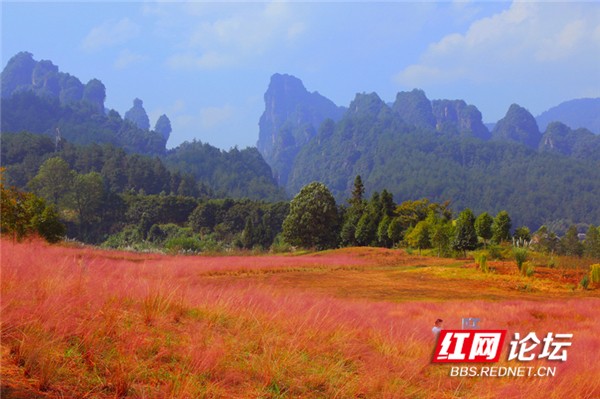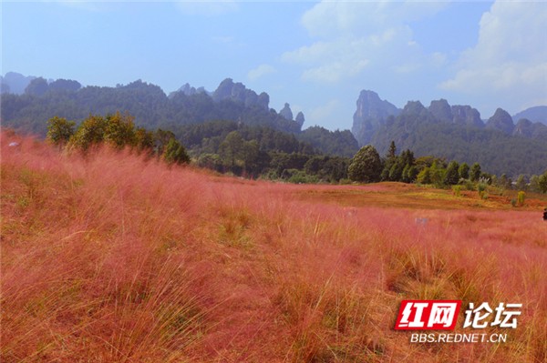 在武陵源区,粉黛乱子草已进入盛花期,伴着微风,一大片粉红色的花穗随风摇曳,如云如雾,如烟似纱,给秋天带来了几分少女般的浪漫。
