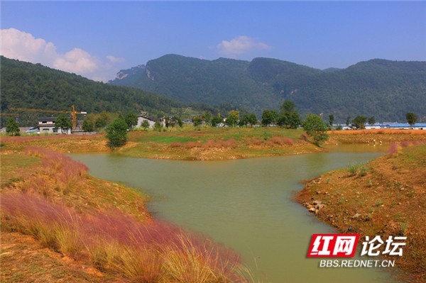 蓝天白云下绿水青山间的粉色花海。图/高山流水A