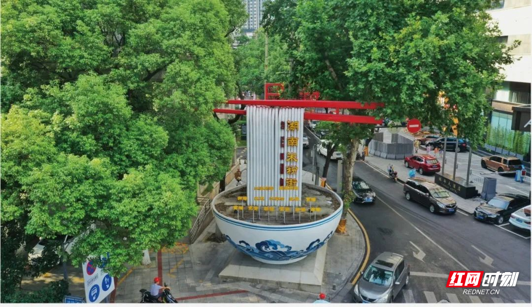 米粉街的标志性大碗伫立于街角,根根分明的米粉恰如长沙人民桌上的美食,令人会心一笑。