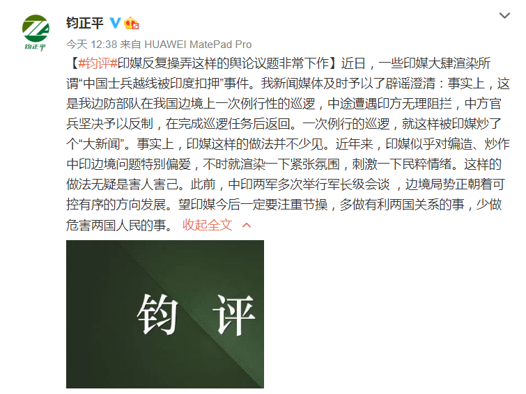 10日,@钧正平 发文斥责印媒反复操弄舆论议题,非常下作。文章称,近日一些印媒大肆渲染所谓“中国士兵越线被印度扣押”事件。我新闻媒体及时予以了辟谣澄清:事实上,这是我边防部队在我国边境上一次例行性的巡逻,中途遭遇印方无理阻拦,中方官兵坚决予以反制,在完成巡逻任务后返回。