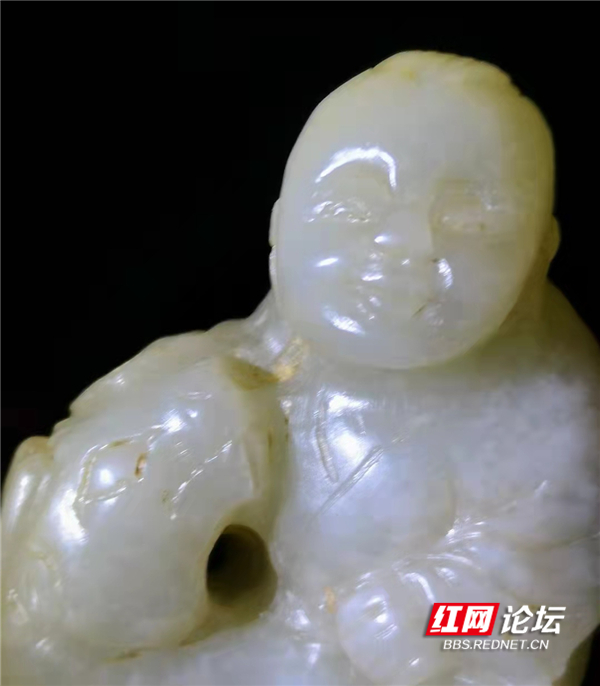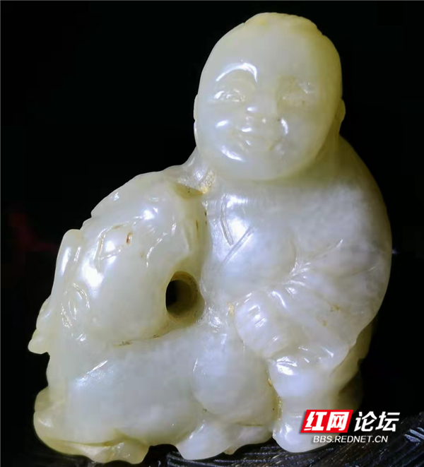 玉质虽一般,题材挺好的。一个童子,抚摸着一只老山羊,人的神态和羊的神态都很自如,情亦缠缠,爱也绵绵,流露着厚重的实感。