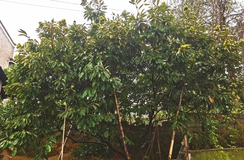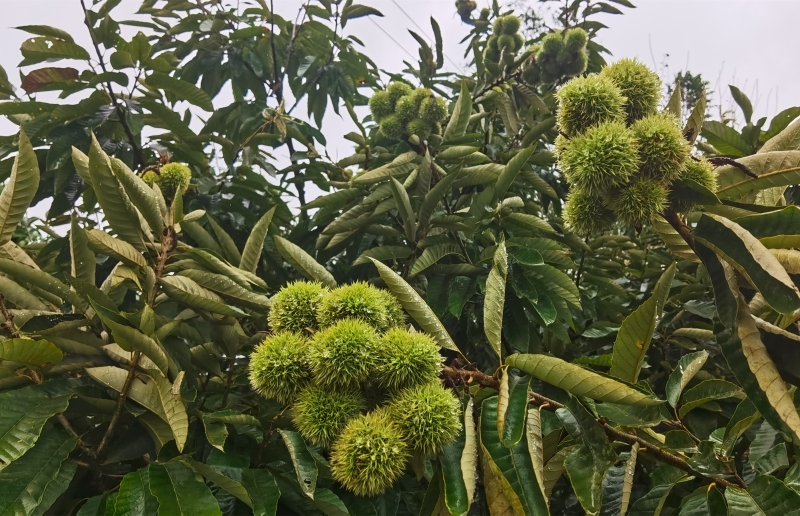 在熊冬生家的左侧,笔者看到了这棵神奇的板栗树。板栗树树高超过5米,一颗颗板栗挂在枝头,随风摇曳。熊冬生介绍,2007年,他在这里建新房,这棵板栗树从旧房处移栽而来。最初几年里,像其他板栗树一样,它也是4月中旬开花,9月中旬成熟,一般结果20来斤。2010年7月上旬,神奇的事情发生了,满树的板栗还没有完全成熟的时候,部分枝条上又开起了板栗花,到当年11月上旬,第二批板栗成熟了,果实大小与第一批相差无几,每粒果肉差不多有三分之一个乒乓球那么大,产量大概有6-7斤。“从2010年至今,已连续11年一年两次开花、两次结果,从没间断过!”熊冬生介绍。为此,他这些年多次向同事、朋友咨询,了解这个“怪事”,大家都对此表示惊奇。“连我93岁的舅舅都说,这么神奇的板栗树,他活了90多岁,都从来没有听说过!”