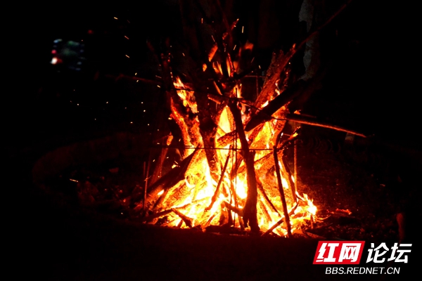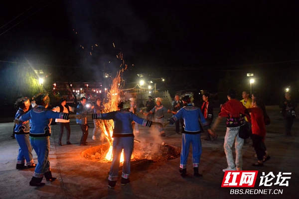 不知不觉中,天空拉下黑幕。好在进入了电气化时代,不需要人们秉烛夜游了。热情的村民穿戴起土家族民族服饰,燃起篝火,围着熊熊火光唱起了山歌。我们也参与其中不亦乐乎,抓住机遇纷纷与村民拍照留影。接着跳竹竿舞,这可要机智灵活,否则就会被夹住脚,怪疼的。