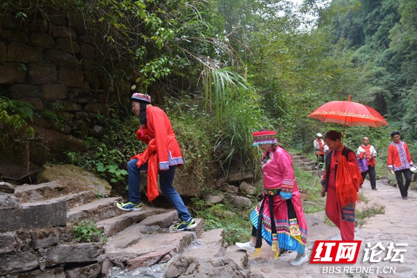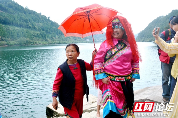 此行真的为我们安排了一场模拟婚嫁的热闹场景。要求在游客中自愿扮演一对做新郎新娘的角色。经一番扭捏作态后,有二人跟着“媒婆”登岸,穿着新娘新郎衣裳,“新娘”戴红盖头和早就准备好的吹鼓手一起,一路朝山冲里走去。我们感到十分新奇。