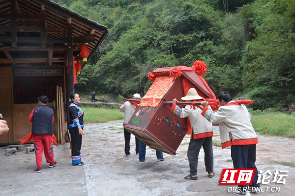 然后新娘上花轿。轿夫边抬边左右摇晃,这叫颠轿。也是轿夫向新娘讨要喜钱的机会,直到新娘颠得受不了告饶求情,给了红包才停止戏耍捉弄。这也是人们最乐意看到的热闹场景。