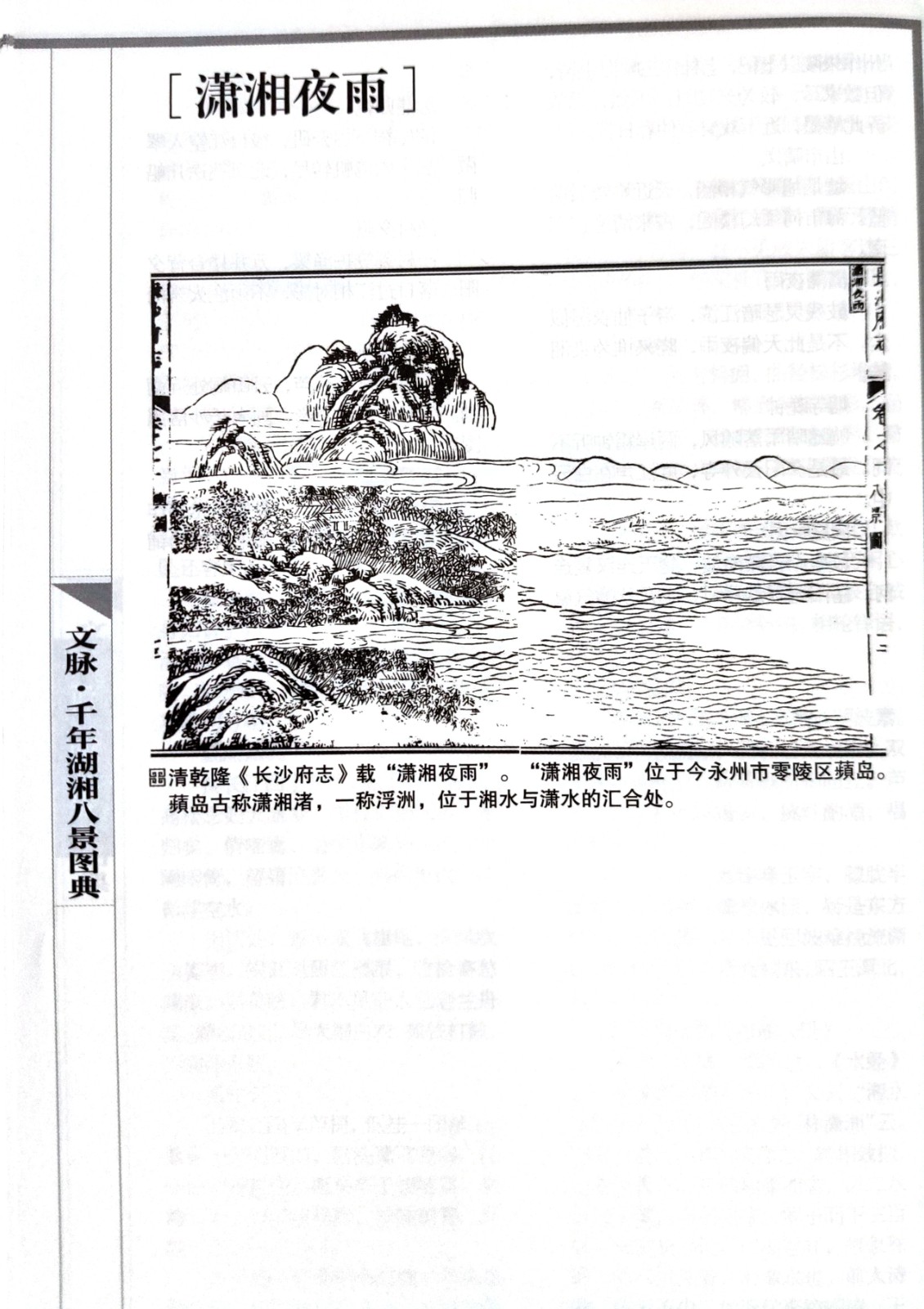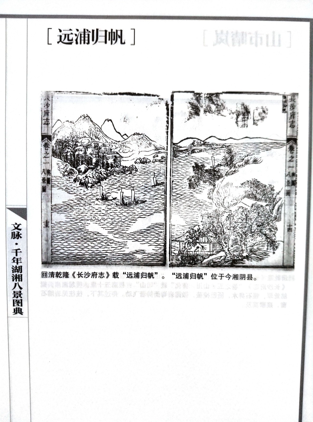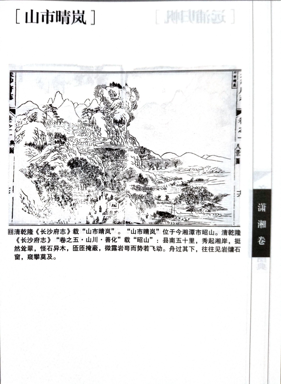 翻开《千年湖湘八景图典》,潇湘夜雨、山市晴岚、远浦归帆、烟寺晚钟、渔村夕照、洞庭秋月、平沙落雁、江天暮雪等经典的“潇湘八景”在一幅幅烟云流动的水墨画卷中徐徐展开,显现出大美潇湘的山水胜境。八景根植于地方的自然山水,也植根于家山的乡土人文。全书所载“八景图”,所引用史料均以方志中“山川”“形胜”“古迹”“艺文”等史料为准,是一部教科书式的史料性方志著述,也表现出湖湘大地耕读人家与山水相依的生活画面。