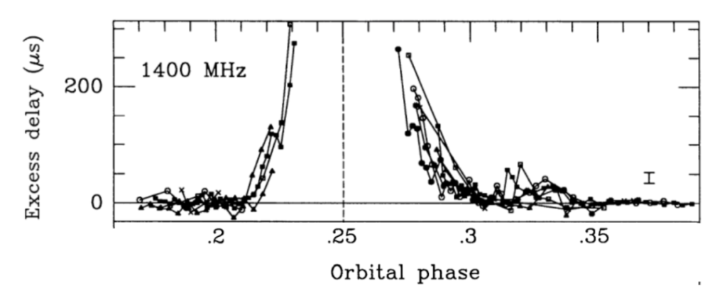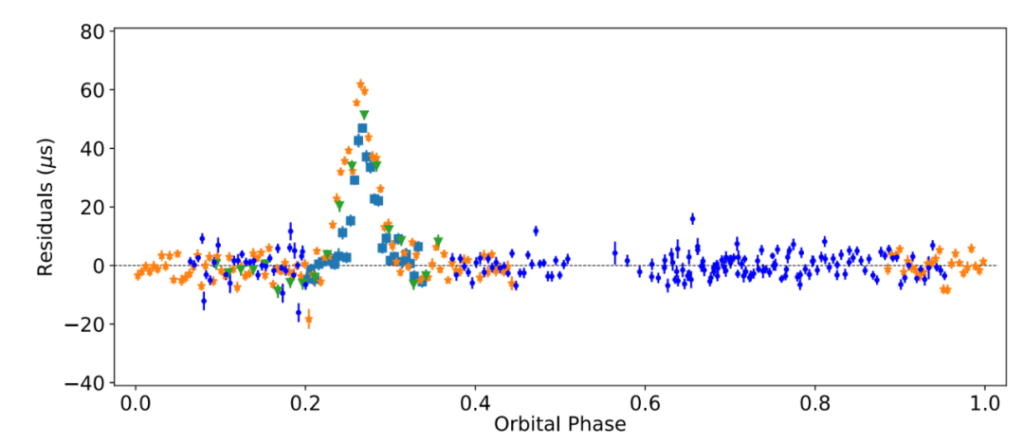 图(b)“黑寡妇”脉冲星J1853-0842A计时残差(时间延迟对应“掩食”期间,中间空白无观测)