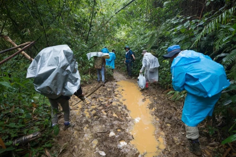 2016年,版纳植物园科考队员在缅甸刚下过雨的密林里行进。谭运洪供图