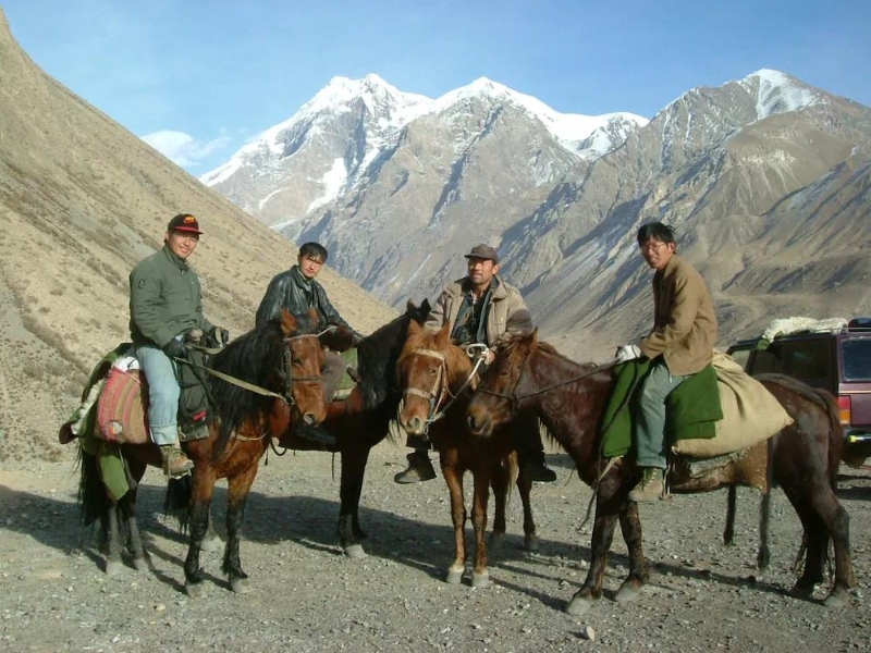 2005年10-11月,马鸣和科考团队在天山托木尔峰进行科学考察(右二为马鸣)。马鸣供图