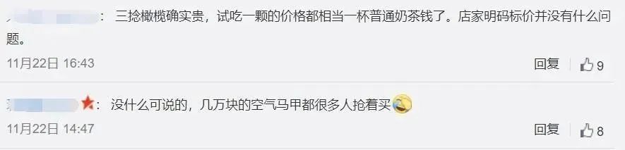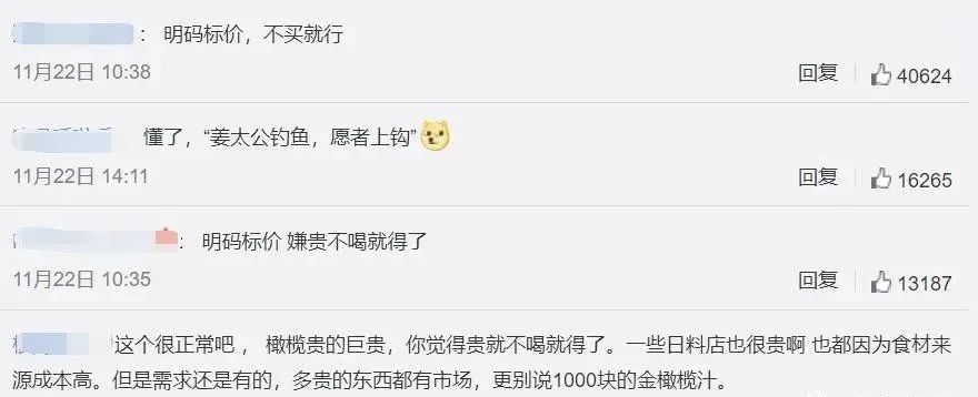 更有网友分析,或许就是商家在做一个活动,靠这个吸引人气和流量,真正店里卖的绝大部分可能还是二十元上下的大众化饮料。极少数人,有钱人,对饮料又特别喜欢,看重所谓的橄榄和年份和品种的人,或许会来这个店里买一杯这样的饮料,“凸显”一下身份和地位图片,大多数人,工薪阶层,来这个店里或许就为瞧个新鲜,尝尝有1000元一杯的饮料的店里的其他饮料是什么味道。