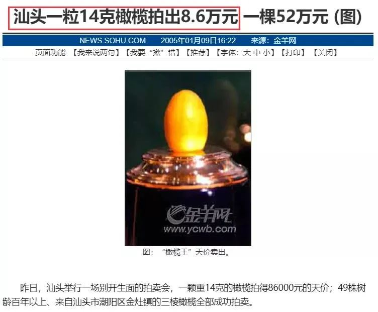 一篇2005年的新闻显示,16年前,汕头的一颗金玉三捻橄榄就拍出了8.6万的价格。