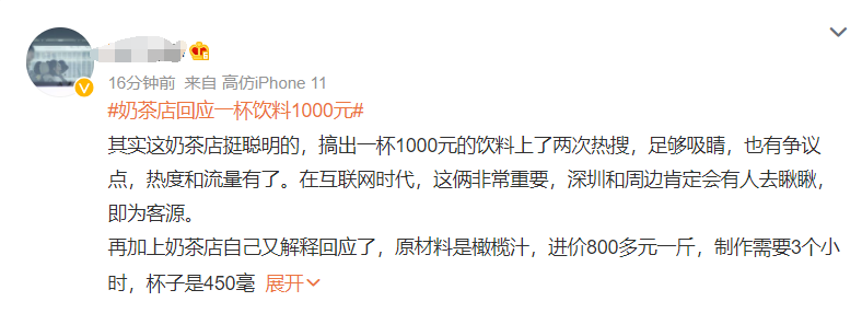 也有网友认为,这是一次非常成功的反营销。一杯1000元的饮料上了两次热搜,足够吸睛。