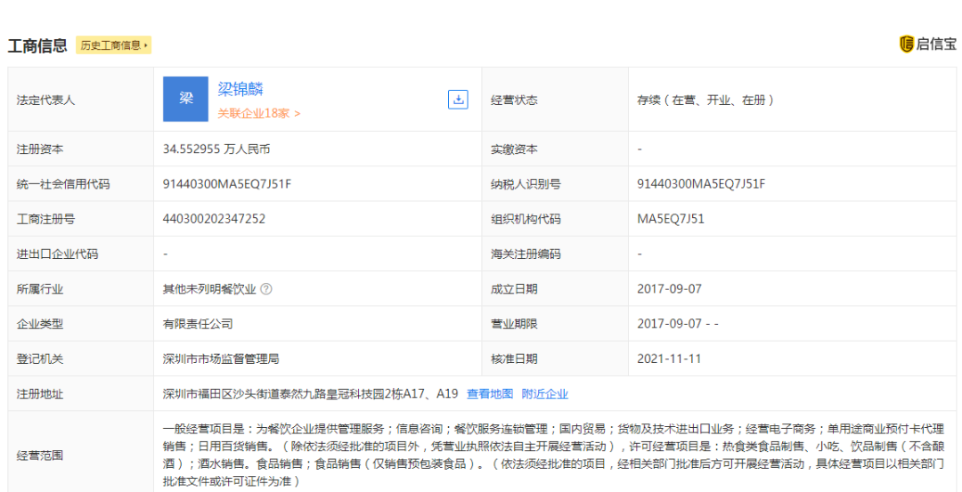 据企信宝,“野萃山”关联公司深圳市豪麟餐饮有限公司成立于2017年9月,注册资本约34.55万人民币,法定代表人为梁锦麟。
