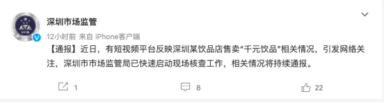 11月22日晚间,据深圳市场监管通报:近日,有短视频平台反映深圳某饮品店售卖“千元饮品”相关情况,引发网络关注,深圳市市场监管局已快速启动现场核查工作,相关情况将持续通报。