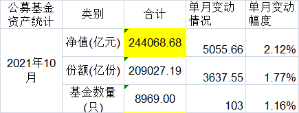 和9月底的数据相比,公募基金规模10月单月增加5055.66亿元,增幅达2.12%;此外,10月基金份额单月增加3637.55亿份,增幅为1.77%;10月基金数量则增加103只,至8969只,进一步逼近9000只。