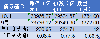 债券基金在10月的规模增加较小,由9月末的3.37万亿元,增加230.65亿元至10月末的3.4万亿元,增幅为0.68%;10月末总份额为2.96万亿份,较9月底增加了224.71亿份。另外,债券基金的数量10月增加了12只。