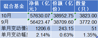其中,混合基金的规模在10月增加了1206.6亿元,从9月末的5.64万亿元升至10月末的5.76万亿元,增幅达2.14%;该类基金份额单月增加243.15亿份,单月增幅为0.63%。