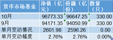 具体到各类公募基金规模的变化情况,10月份规模增长最多的是货币基金,其资产净值从9月末的9.42万亿元升至10月末的9.68万亿元,大幅增加2601.98亿元;同时,货币基金总份额从9月末的9.41万亿份增至10月末的9.66万亿份,增加了2596.26亿份。