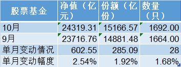 股票基金规模同样在10月出现超过2%的增长。该类基金9月末规模为2.37万亿元,10月末为2.43万亿元,单月增加602.55亿元,增幅为2.54%。