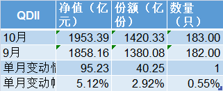 QDII基金虽然在单月规模变动绝对值上增量最小,仅增加95.23亿元至1953.39亿元,但单月增幅高达5.12%;该类基金份额单月增加40.25亿份至1420.33亿份,增幅为2.92%;数量上10月增加了1只。
