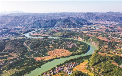 这是11月10日航拍下的湖南省新宁县黄龙镇三星村。弯弯的夫夷江两岸布满橙园,崀山脐橙挂满枝头。郑国华 陈秋红 摄(“森林中国”全国林业新闻摄影大赛)