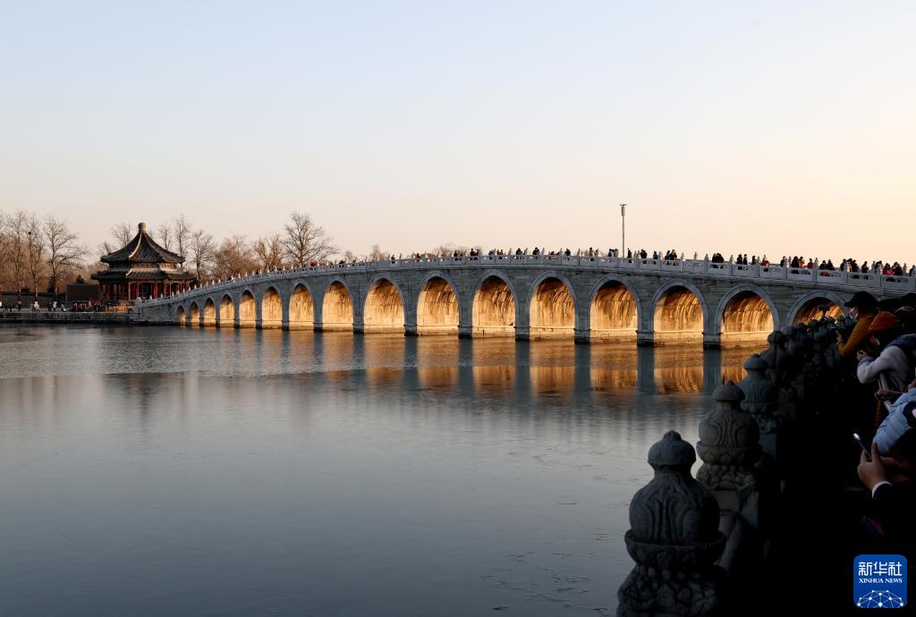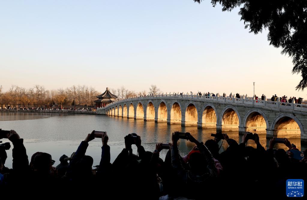 11月25日,游客在北京颐和园南湖岛拍摄“金光穿洞”。