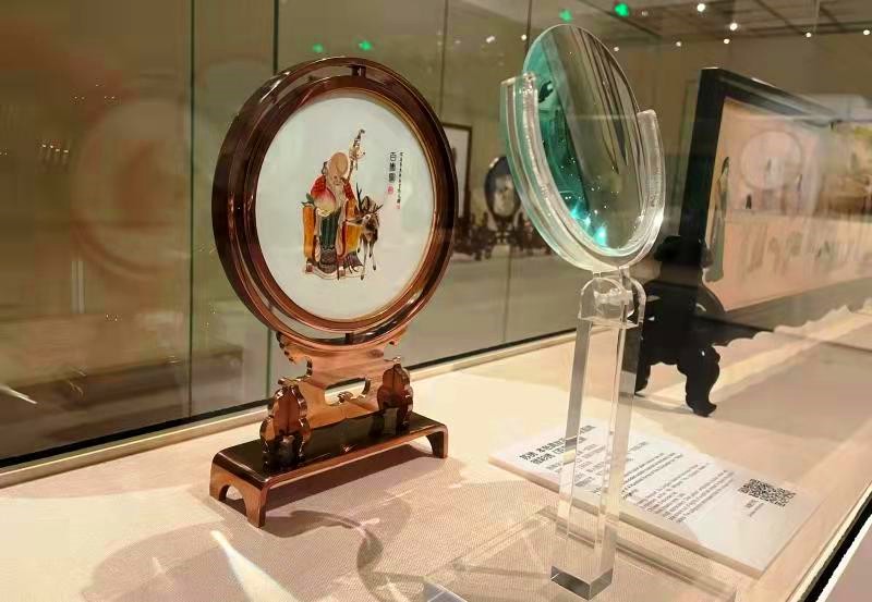 苏绣发源地在苏州吴县一带,现已遍衍无锡、常州等地,具有图案秀丽、构思巧妙、绣工细致、针法活泼、色彩清雅的独特风格,地方特色浓郁。绣珍阁珍藏的无锡精微绣传承人吴鸣文大师巅峰之作《百寿图》双面精微彩绣,在直径仅10厘米的篇幅内,绘制了南极仙翁手捧仙桃祝寿的形象,将108个篆体“寿”字绣入袍服,并且正反面都相同,在40倍放大镜下,可捕捉到精妙绝伦的神韵,两面都呈现出精致华丽的立体图案。绣制时要将一根丝线劈成八十分之一,其技艺风格堪称精巧微细,属于世界级的精品。