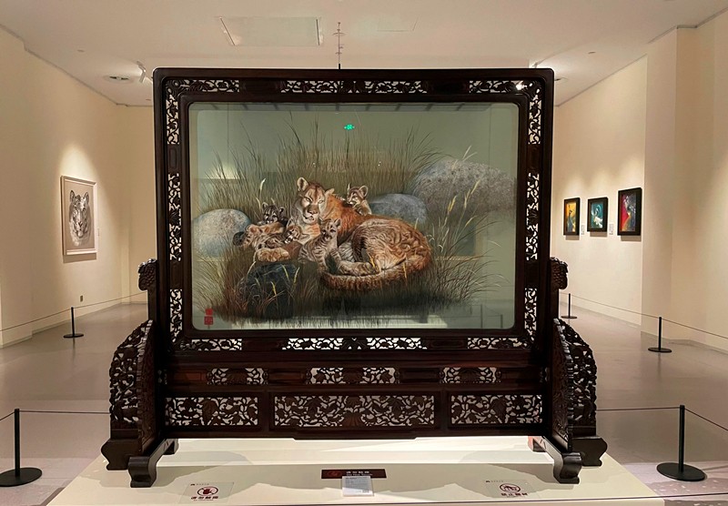绣珍阁珍藏的《美洲狮与狐狸屏风》,为湘绣史上动物题材最大的一幅双面全异绣,是湘绣大师李艳的杰出代表作品之一。作品以油画为稿本,将湘绣乱针绣、掺针绣、交叉绣、鬅毛针等多种针法的巧妙运用,逼真展现了动物质感的皮毛、灵动的眼睛,完美呈现了野生美洲狮、狐狸的温馨家庭组合。由李艳大师所设计的《长江颂》《黄河颂》,宛若身入真情实景。绣品长度均为12米,是迄今湘绣史上山水题材最长的绣品,也是当代湘绣最高技艺水平与艺术境界的传世之作。