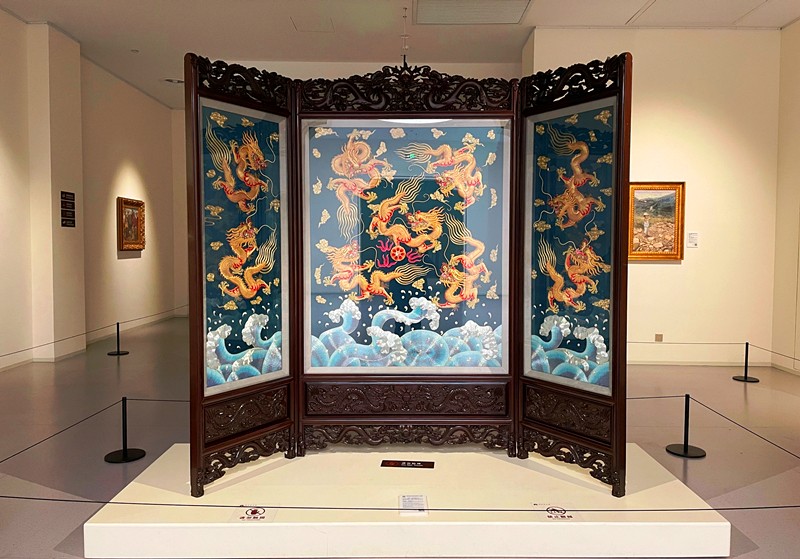 粤绣是广东地区代表性刺绣,是广州刺绣和潮州刺绣的总称,刺绣所用材料广泛,富有传统特色和鲜明的时代气息,绣品技艺精湛,匠心独运,享誉中外。林玩英、李木兰和王锦兰三位潮绣老艺人绣制的《九龙图围屏》,是潮绣中的代表作品,曾荣获第一届中国工艺美术百花奖金奖。作品采用真金真银线绣制,使用垫高绣针法,在绣的纹路上铺贴一些棉絮、纸片垫高成形九条昂扬向上的飞龙和汹涌澎湃的海浪,绣品具有浮雕般的立体感,工艺难度大,代表当代潮绣艺术创新的最高水平。